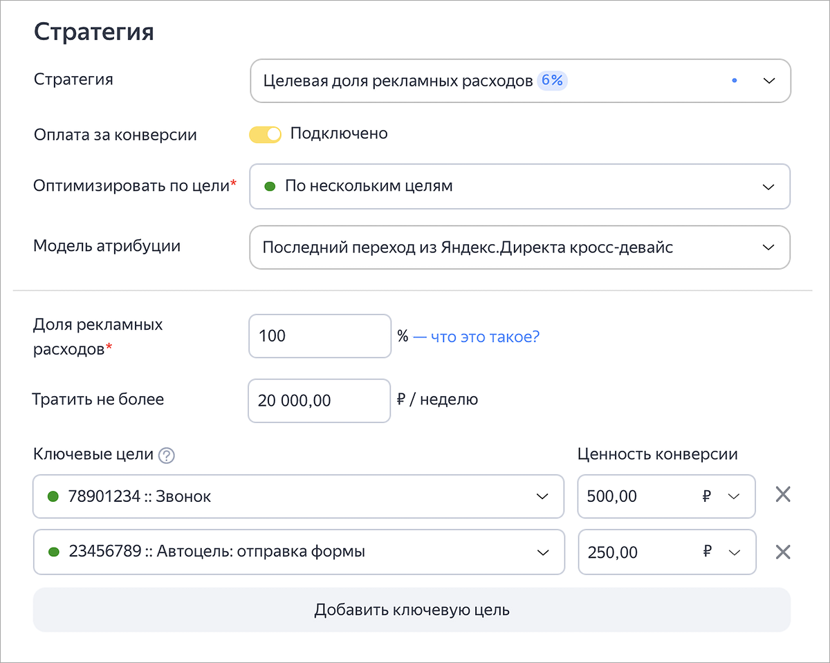 Подробнее о работе с ключевыми целями и обновленными стратегиями читайте в блоге Яндекса и Руководстве по ключевым целям.