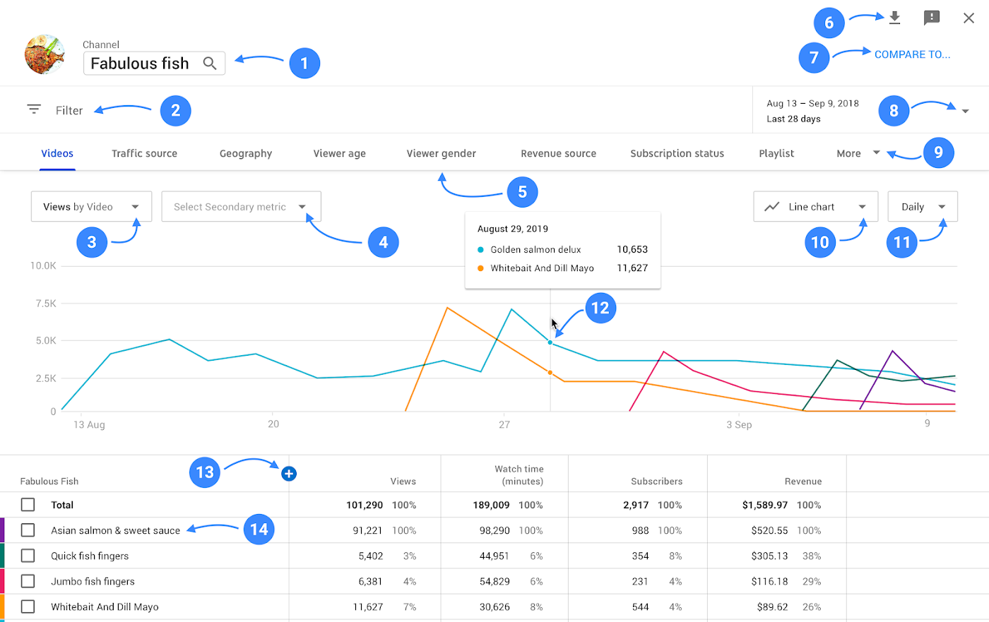Чтобы воспользоваться новым отчетом, перейдите в Творческую студию YouTube, выберите раздел «Аналитика», затем нужный отчет и нажмите «Расширенный режим» или «Подробнее».