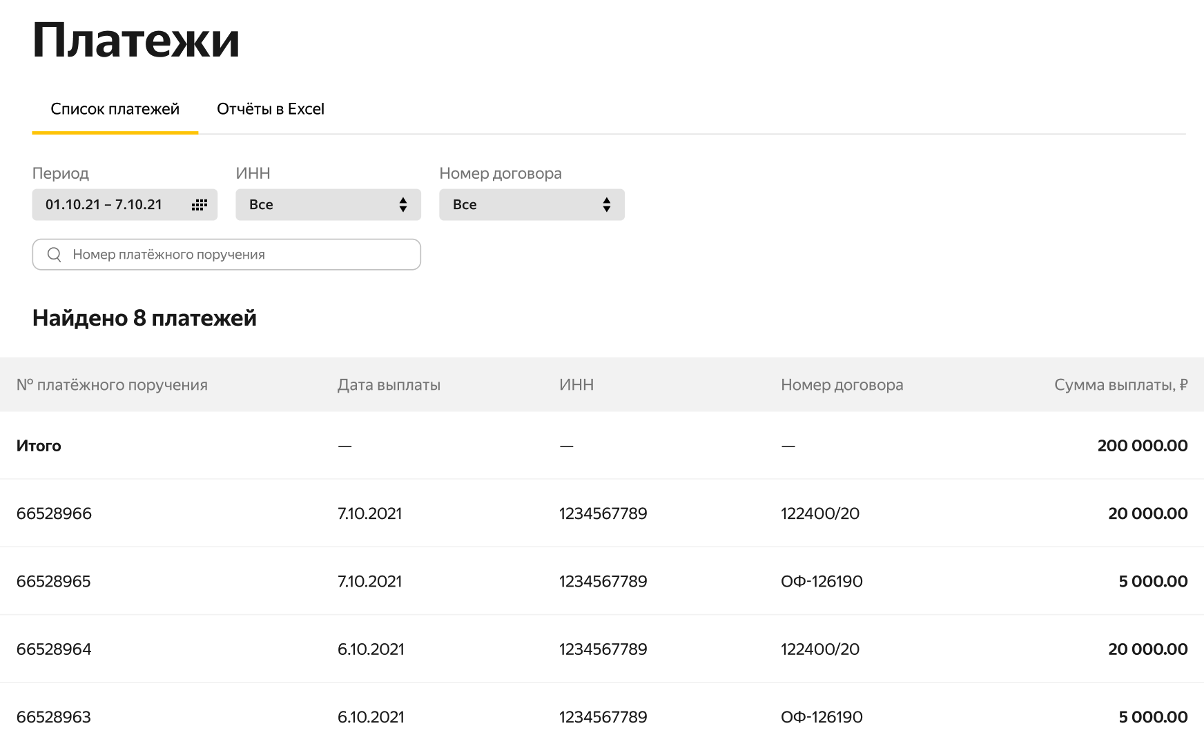 На обновленной странице в личном кабинете вы увидите все операции в ваших магазинах с номерами платежных поручений, датами и сумма и платежей. Фильтровать платежи можно по ИНН, номеру договора и дате.