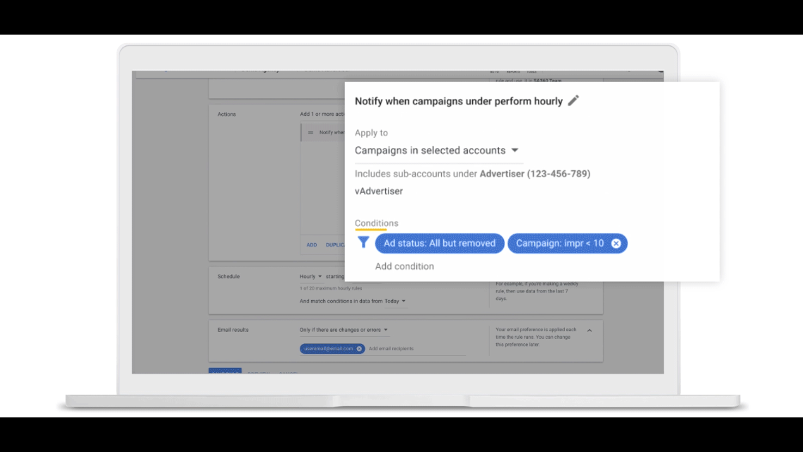 Для работы с несколькими кампаниями Search Ads добавил функцию «Автоматический конструктор правил». С его помощью можно установить единые настройки в кампаниях или группах объявлений, а также ключевых словах и целях на основе выбранных критериев. Подробнее о конструкторе можно почитать в Справке.