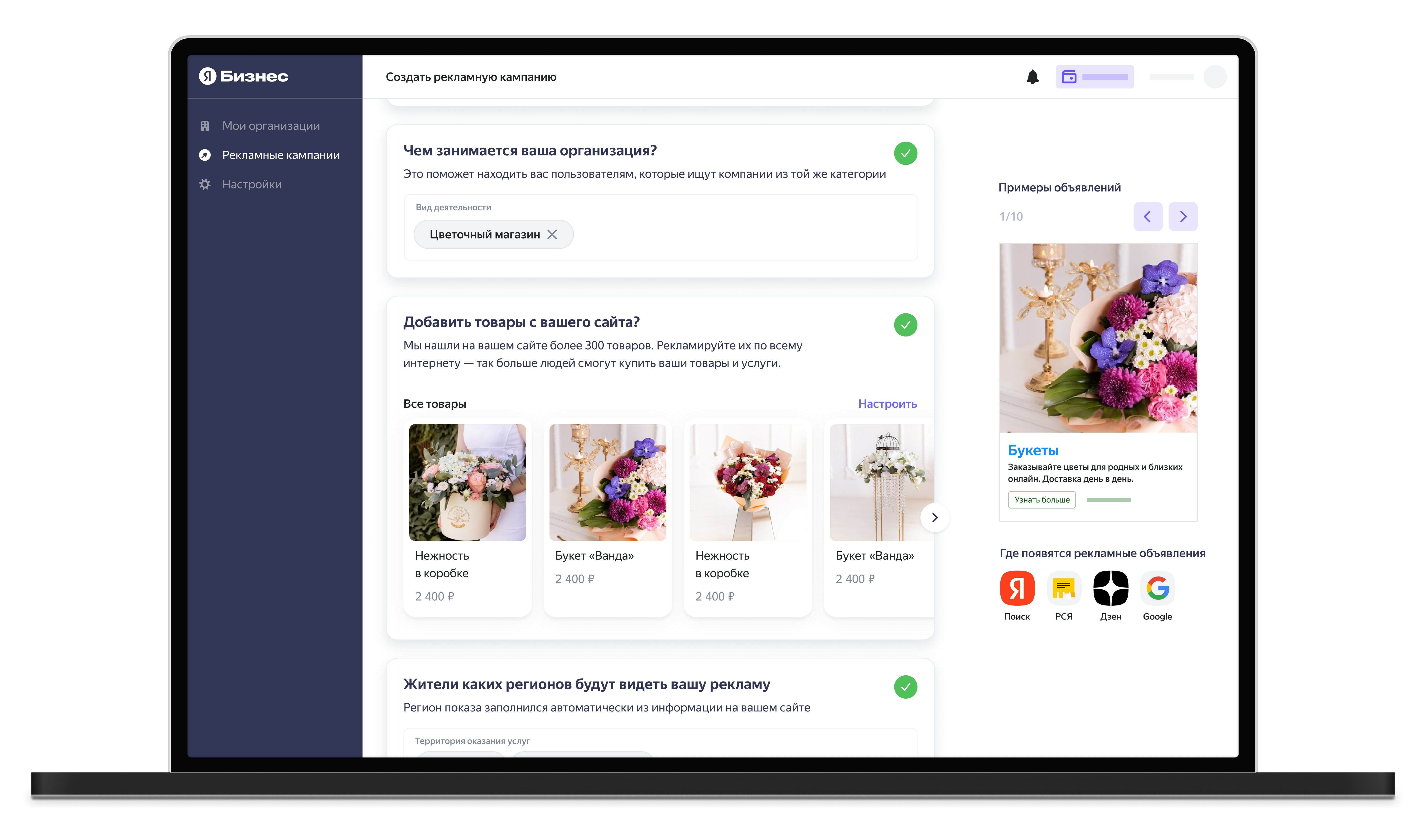 Алгоритмы проанализируют все рекламные площадки (Поиск, Дзен, все партнеры РСЯ, а также Gmail и YouTube) и выберут ту, на которой есть потенциальные покупатели. Список товаров можно менять после старта кампании в личном кабинете, где также может следить за статистикой по переходам, звонкам и другим важным показателям.