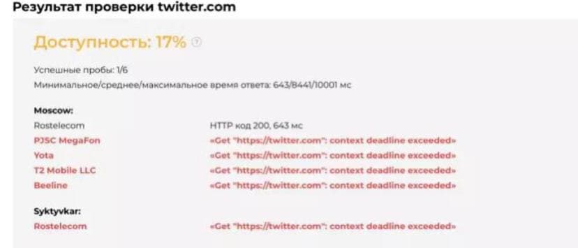 Средняя доступность Twitter в России составляет всего 17%. Его работу блокируют для сетей мобильных операторов Мегафон, Yota, Tele2 и Beeline.