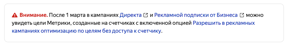 Посреднику будет доступна лишь та статистика, которая необходимо для оценки эффективности кампаний. Дать доступ на использование целей в Метрике можно на странице «Цели» с помощью опции «Разрешить в рекламных кампаниях оптимизацию по целям без доступа к счетчику».