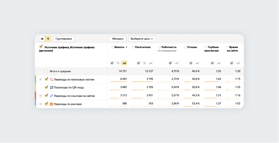 Наконец, в Метрике появился новый источник трафика — «Переходы на QR-кодам». Чтобы данные корректно присваивались новому источнику, необходимо корректно прописать метки в ссылках. Подробнее о настройке меток читайте в Справке.