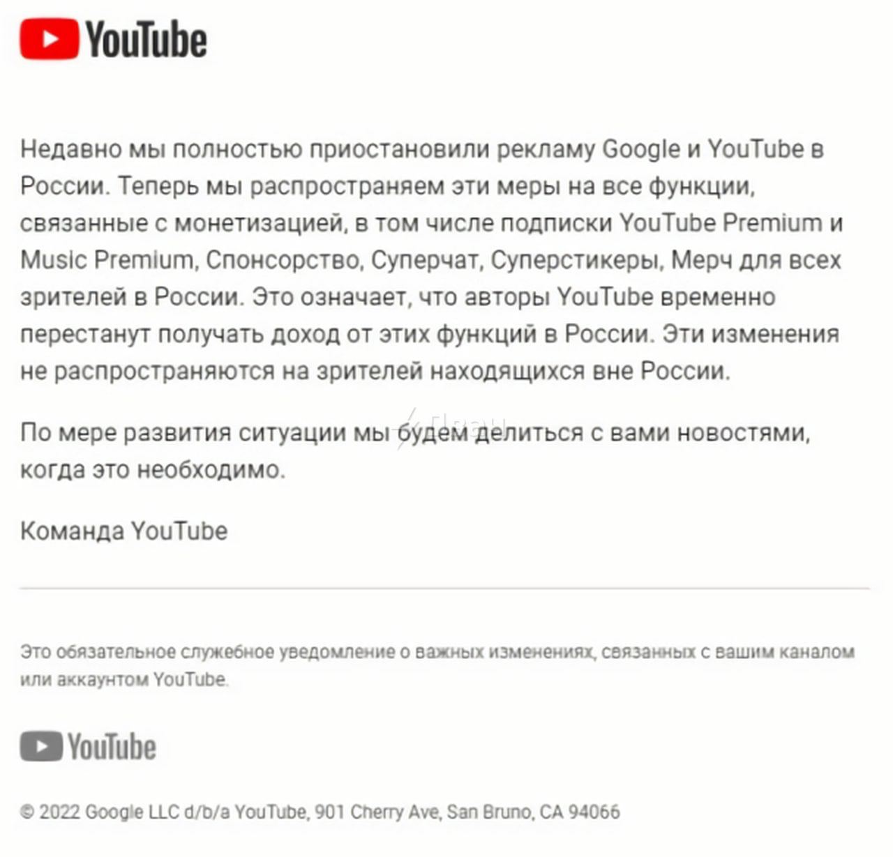 YouTube разослал всем пользователям из РФ уведомление, сообщающее о приостановке всех возможностей, связанных с монетизацией на платформе. Это означает, что помимо прекращения рекламных кампаний и остановки монетизации для блогеров, свои подписки YouTube Premium потеряют все пользователи из России.