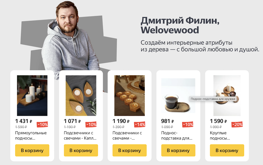 Все товары в подборке продавец выбирает самостоятельно — в зависимости от той сферы, которую он собирается продвигать. В первую подборку от Яндекса уже входят пряности и чаи, шоколад, деревянные подносы и подсвечники, наборы для творчества, кофеварки, дрип-кофе, развивающие детские книги, аксессуары, украшения, декоративные цветы и другое. Но вы можете не ограничиваться этими категориями.