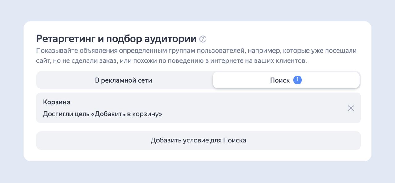 В отличие от рекламы в РСЯ, ретаргетинг в Поиске не может работать как самостоятельное условие показа, а вместо оператора «ИЛИ» используется «И». Объявления увидят пользователи, которые соответствуют условиям ретаргетинга и условиям показа: ключевым фразам и критериям автотаргетинга. Пока он доступен на Поиске для текстово-графических объявлений.