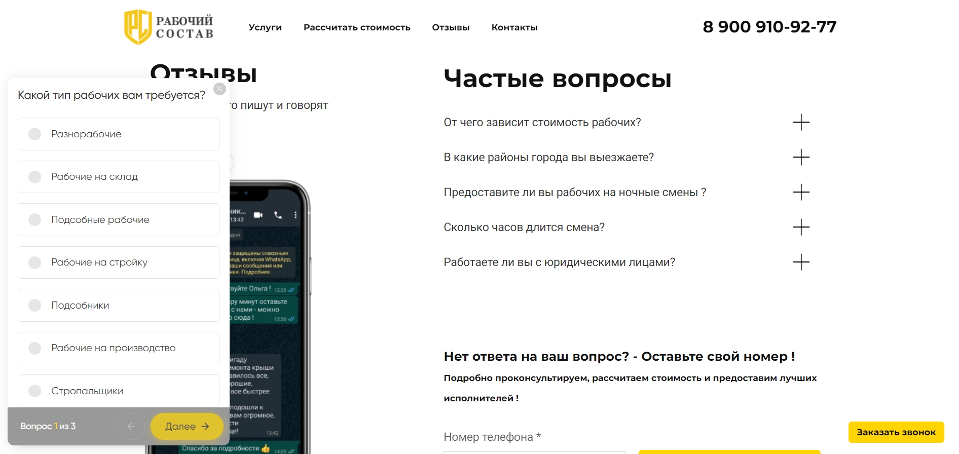 Создание сайтов в визуальном редакторе на основе шаблонов. Есть конструктор сайта компании, лендинга, интернет-магазина, визитки, квиза, калькулятора. Можно создать одностраничный сайт в конструкторе, заказать выгрузку кода и разместить его на своем хостинге.