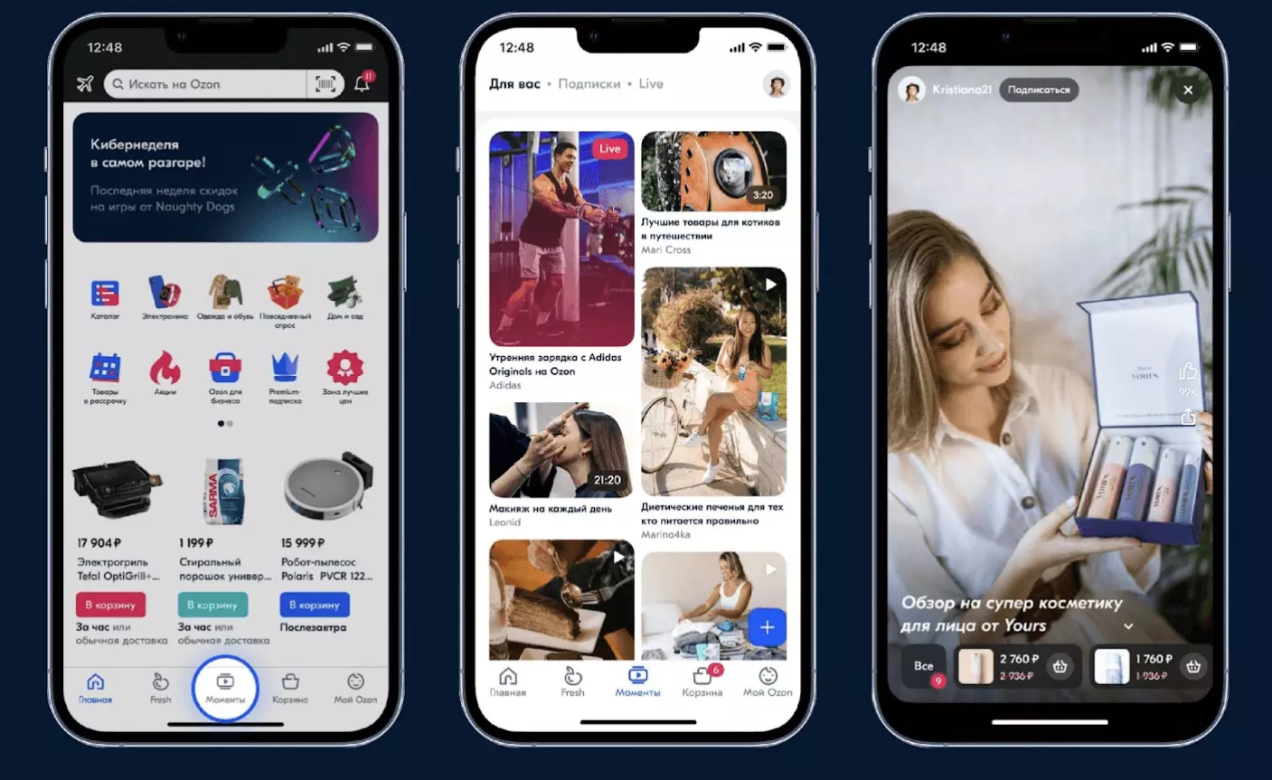 Ozon добавил в свое приложение раздел «Моменты» — это медиацентр с контентом от продавцов и покупателей. И те, и другие могут загружать в «Моменты» фото и видео о товарах. При этом маркетплейс приветствует разнообразие контента — в «Моментах» можно рассказывать о путешествиях, лайфхаках и прочих вещах.