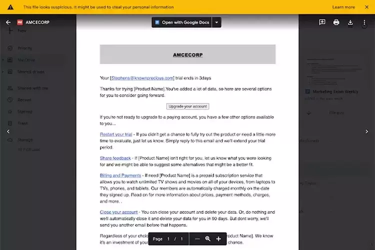 Google продолжает бороться со спамом и фишингом. Чтобы обезопасить своих пользователей, они создали специальный баннер, который оповещает о потенциально вредоносном контенте внутри документа. Такой баннер уже появляется при работе с Диском. В дальнейшем к нему присоединяться все офисные продукты Google: Docs, Sheets, Slides и другие.