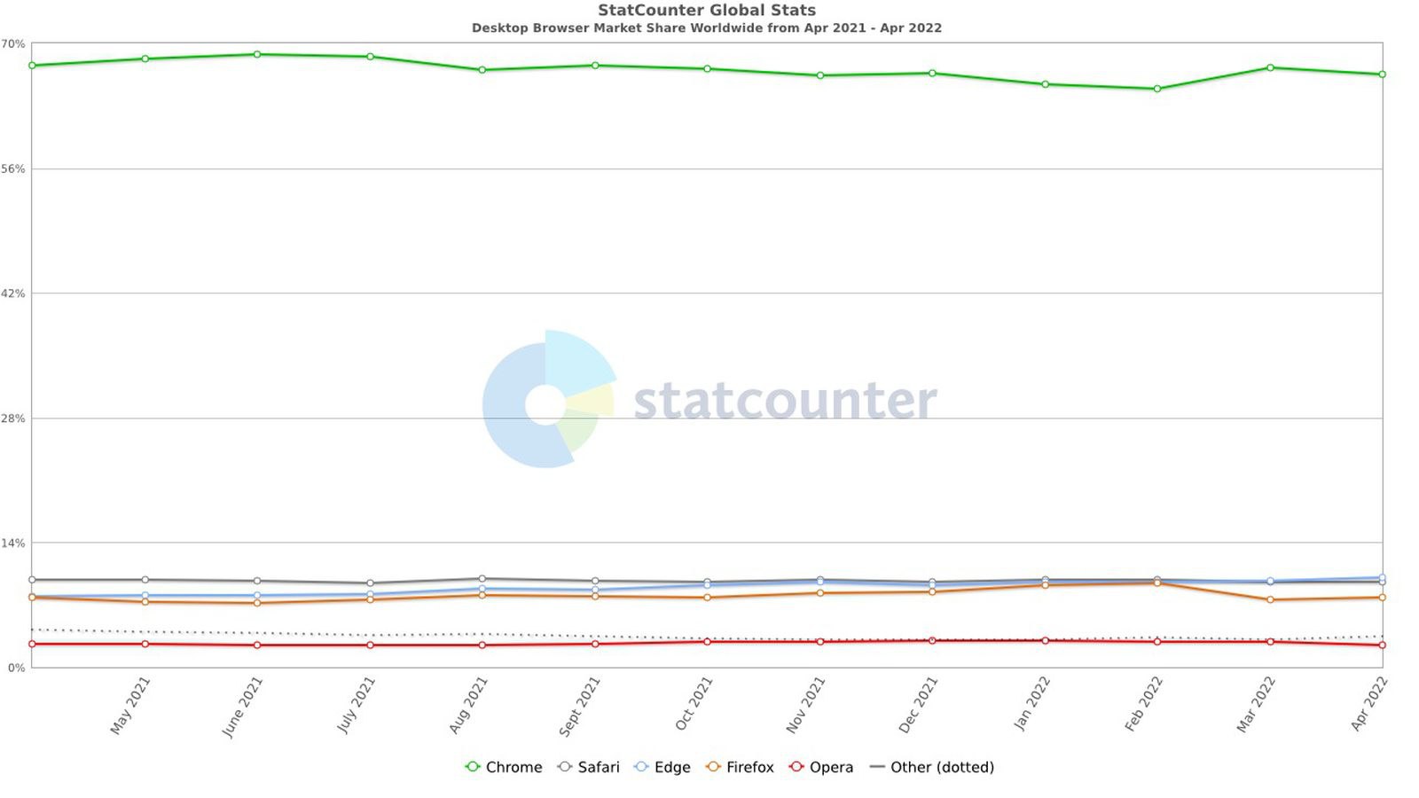 Microsoft Edge официально стал вторым по популярностью браузером после Chrome, с небольшим отрывом обогнав фирменный браузер Apple — Safari. Как сообщает служба веб-аналитики StatCounter, доля браузера Microsoft на десктопах составила в текущем апреле 10,07% против 9,61% у Safari. Доля ведущего в списке браузера — Google Chrome — составляет 66,64%.