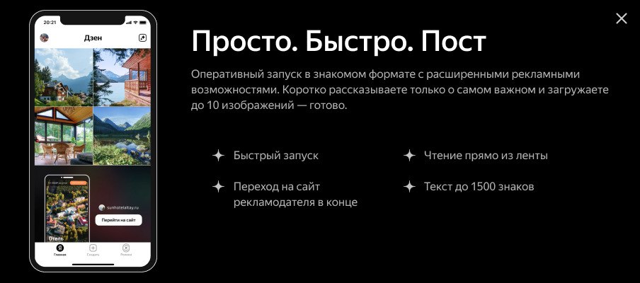 Команда Дзена начала открытый тест рекламных постов — читать и просматривать такие публикации пользователи могут прямо из ленты. ПромоПосты ограничены 1500 знаками и 10 изображениями. В конце публикации размещается анимированный Scroll2Site на ресурс рекламодателя.