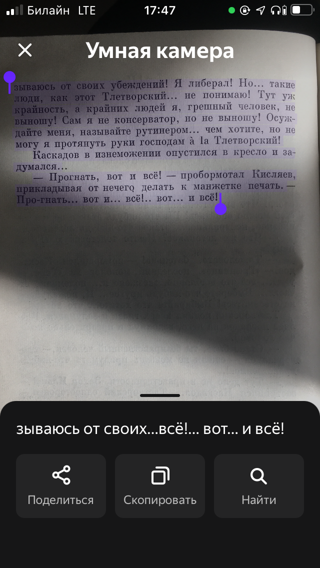 В приложении «Умная камера» Яндекса появилась новая возможность — режим «Текст». С его помощью вы можете направить камеру на любой текст или фразу (реклама, обложка или страница книги, надпись на футболке) и в один клик скопировать полученный текст в свой смартфон. После сохранения текст сразу можно отправить в Мессенджер или запустить в поиск Яндекса.