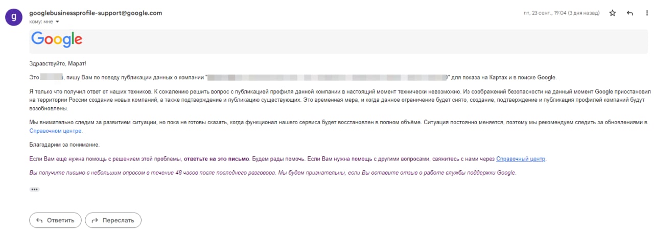 Многие оптимизаторы столкнулись с невозможностью добавлять новые, а также подтверждать уже существующие компании в бизнес-профиле Google на территории РФ. Как сообщают коллеги из Телеграм-канала АлаичЪ, на почту стали приходить письма от техподдержки Google о введении временных мер для ряда функций Business Profiles и Maps.