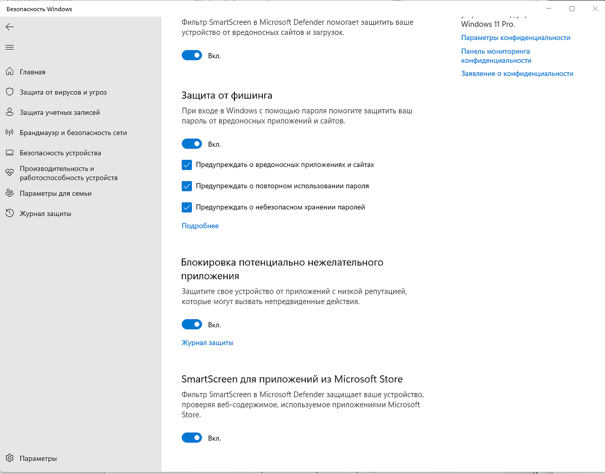 Чтобы подключить новую функцию, перейдите в Пуск → Параметры → Конфиденциальность и защита → Управление приложениями и браузером → Защита на основе репутации. В разделе «Защита от фишинга» выберите два флажка: «Предупреждать о повторном использовании пароля» и «Предупреждать о небезопасном хранении паролей».