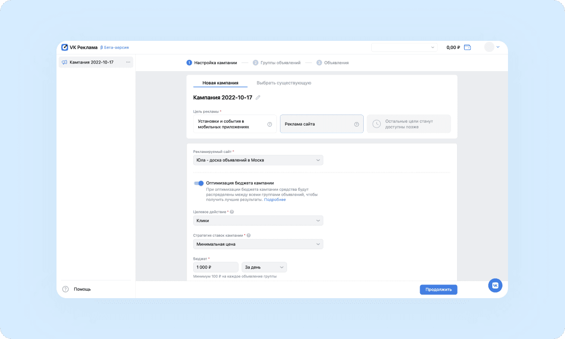 В личном кабинете доступна оптимизация бюджета на уровне кампании, размещение объявлений сразу на всех площадках VK, а также автоматическое управление ставкой. Для продвижения сайтов доступны следующие варианты оптимизации кампаний: