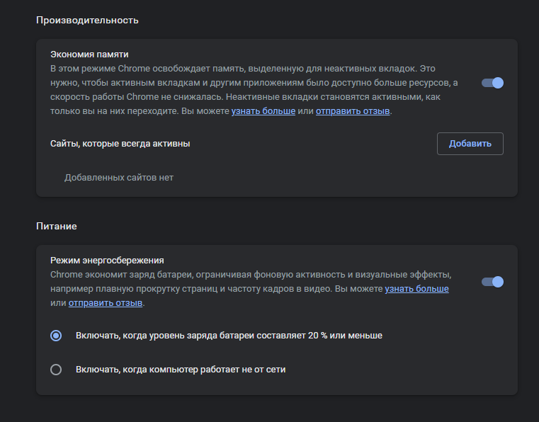Режим экономии оперативной памяти и снижения нагрузки на процессор можно включить через скрытые настройки в Canary. Для этого необходимо перейти по адресу chrome://settings/performance. В появившемся окне вы можете выбрать доступные опции: режим экономии памяти и функцию энергосбережения .