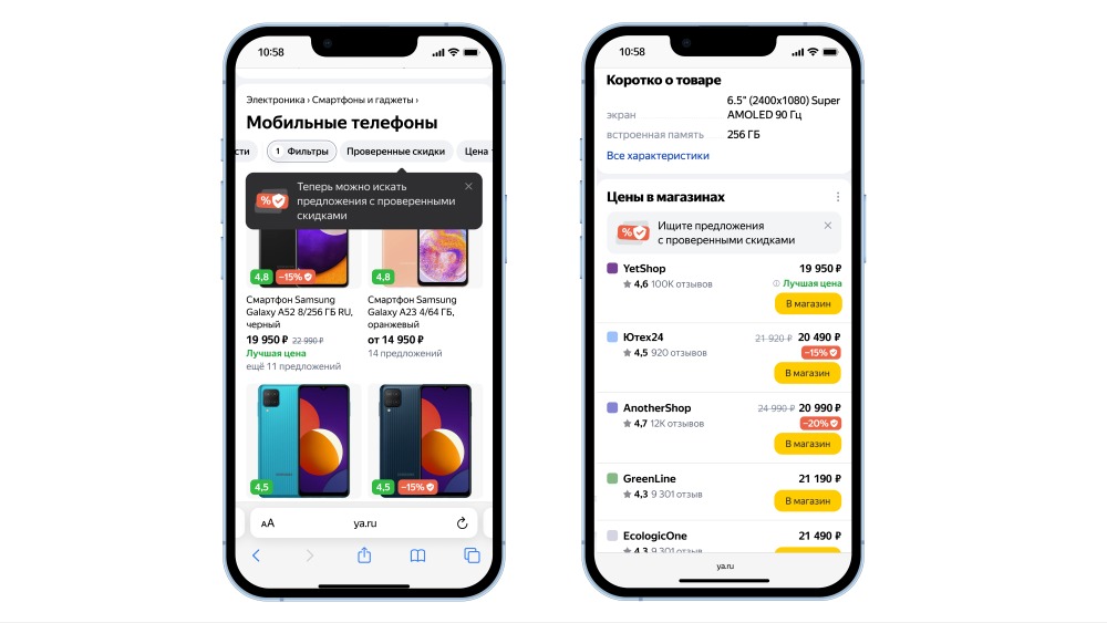 Алгоритм смотрит динамику изменения цены товара, и если она не повышалась до распродажи в течение двух месяцев, такая цена появится в карточке товара. Покупатель увидит выгоду в процентном соотношении и какие товары проверку прошли, а какие — нет. Найти акционные предложения можно с помощью фильтра «Проверенные скидки».