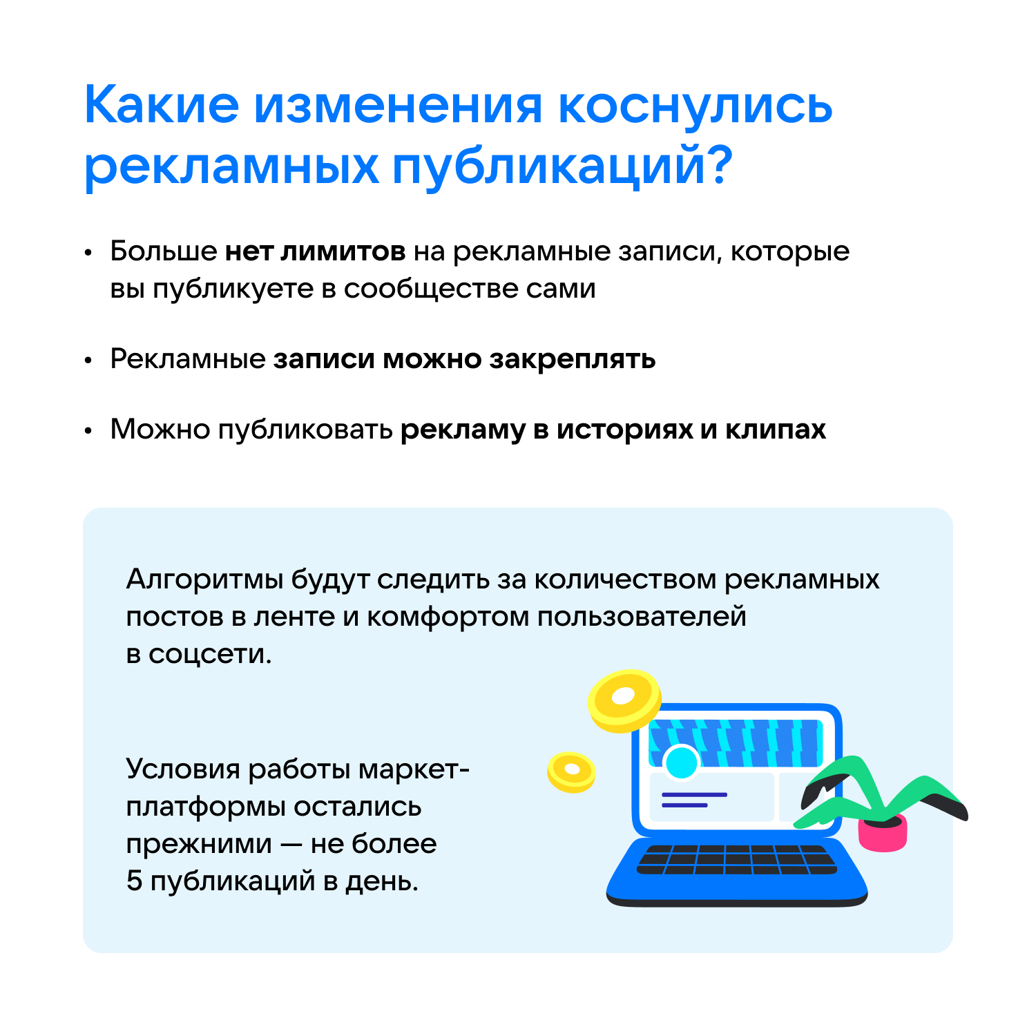 ВКонтакте отменил ограничения на число публикаций прямой и нативной рекламы, которую автор запускает самостоятельно. Теперь у оптимизаторов появится больше возможностей выстраивать свою политику монетизации, а алгоритмы будут следить за эффективностью рекламных постов в статистике.