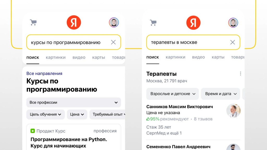 Изменилось отображение результатов в поиске. Теперь Яндекс не только индексирует страницы, но и выдает искомую информацию на карточке предпросмотра. Например, при поиске терапевта в Москве, вместе с веб-страницей вы получите информацию об имени врача, его времени работы и номере телефона. То же касается поиска всех прочих услуг: на карточке вы сможете оценить условия и сразу увидите число отзывов и рейтинг.