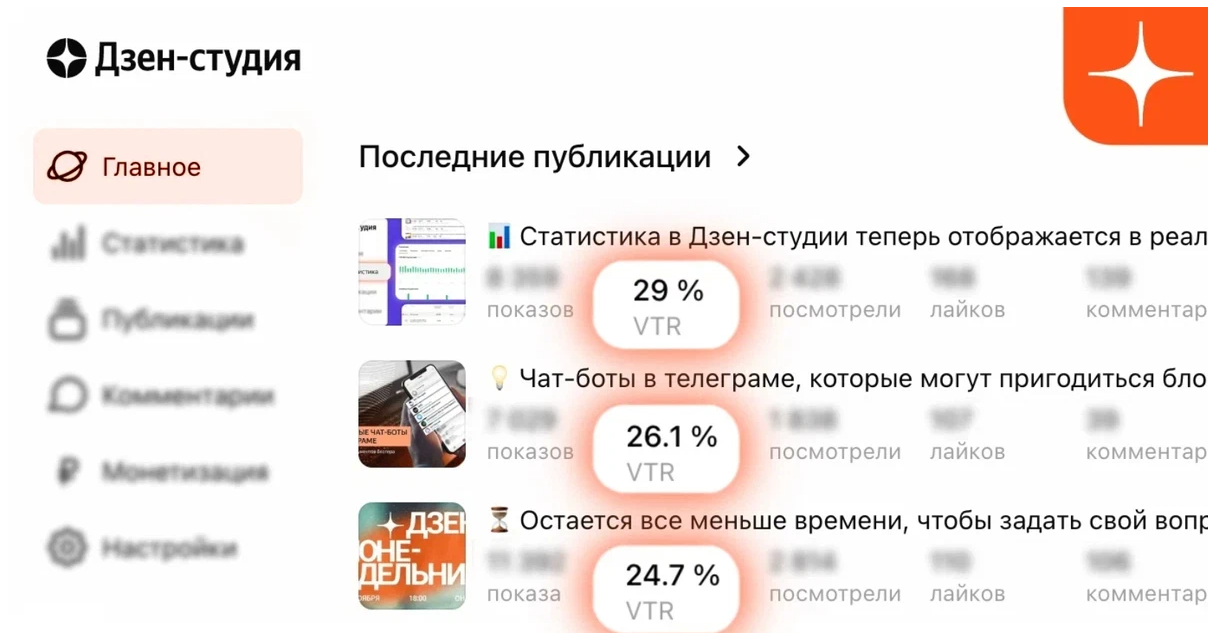 На главной странице Дзен-студии изменилась основная метрика по просмотрам. На смену привычному CTR (соотношение кликов к показам) появилась более релевантная метрика — VTR. Она отображается во втором столбце раздела «Последние публикации» в процентном соотношении.