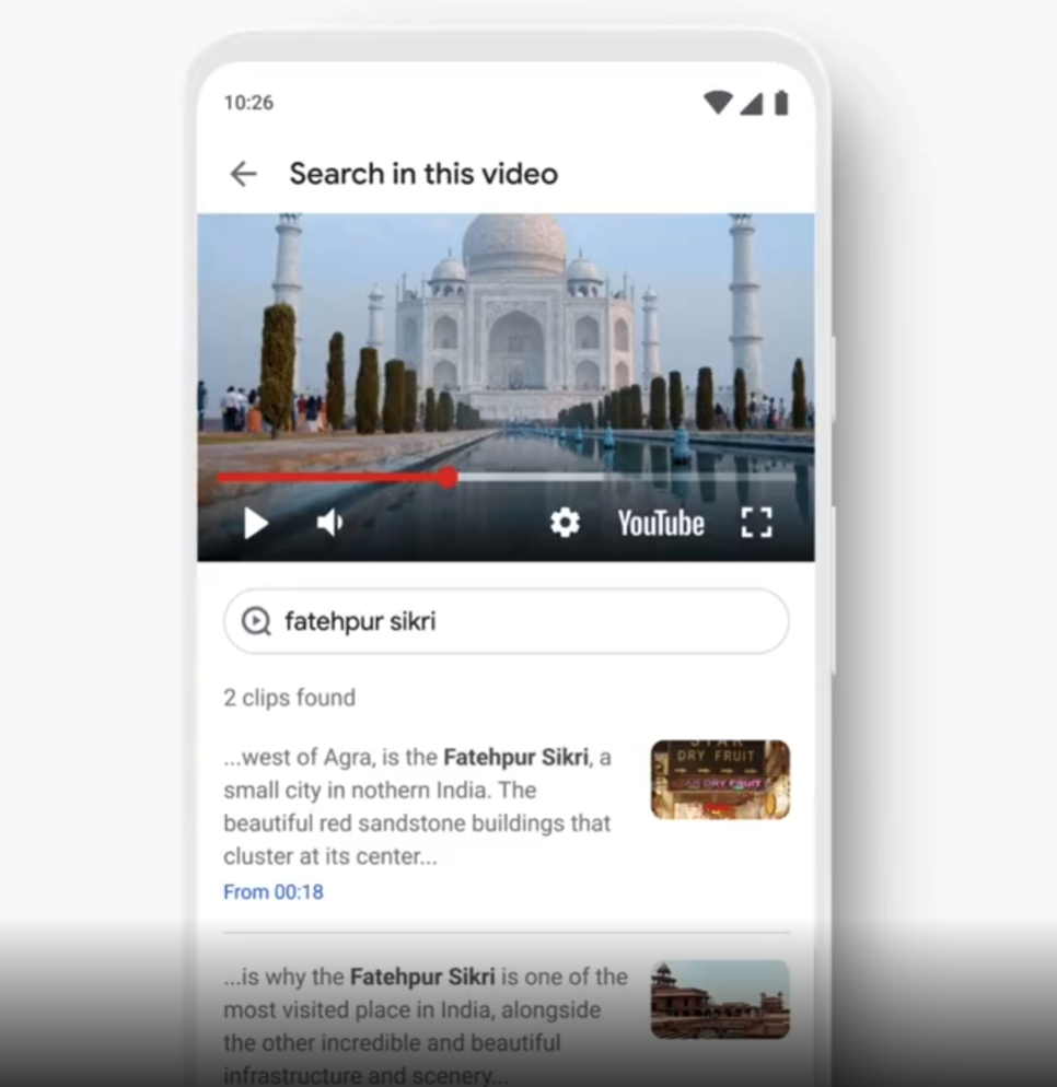 Например, можно уточнить, есть ли упоминание города Фатехпур-Сикри в видео об Агре. Функция расшифровывает всю текстовую информацию в видео и находит упоминания вашего запроса.