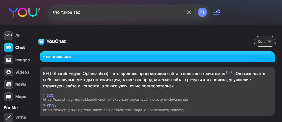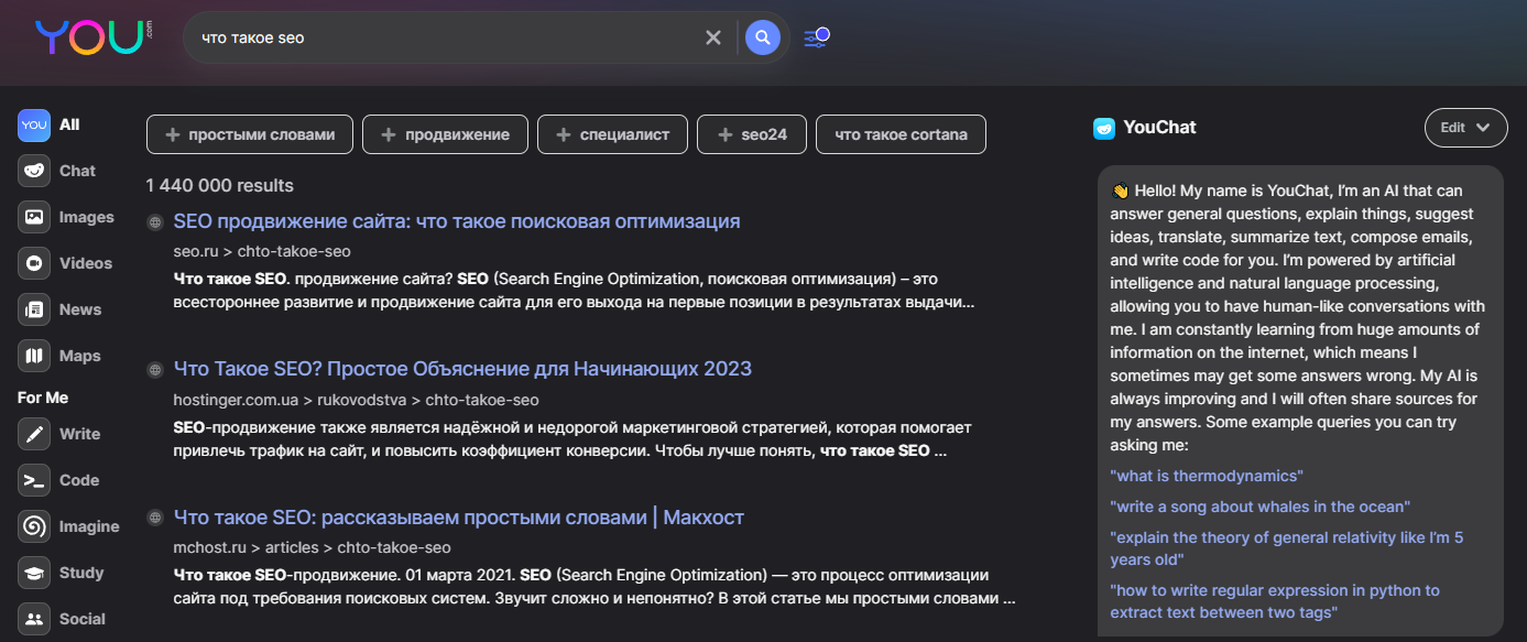 Поисковик You.com, который стартовал в прошлом году, уже использует ChatGPT для получения результатов. Чат-боту выделен отдельный блок справа от выдачи, где нейросеть действует согласно своей полной функциональности: способна вести беседу, запоминать предыдущие результаты, переводить текст в код и так далее.