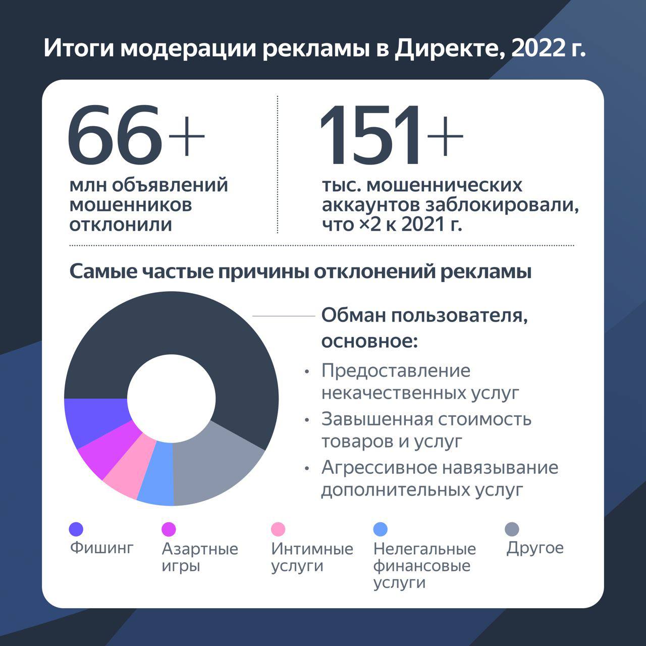 Яндекс сообщил о работе модераторов в ушедшем году. Команда удалила или не допустила к показу свыше 66 млн мошеннических или нарушающих правила платформы объявлений. Значительная их часть пришлась на продажу поддельных товаров, мошеннические финансовые услуги, незаконные услуги и фишинг.