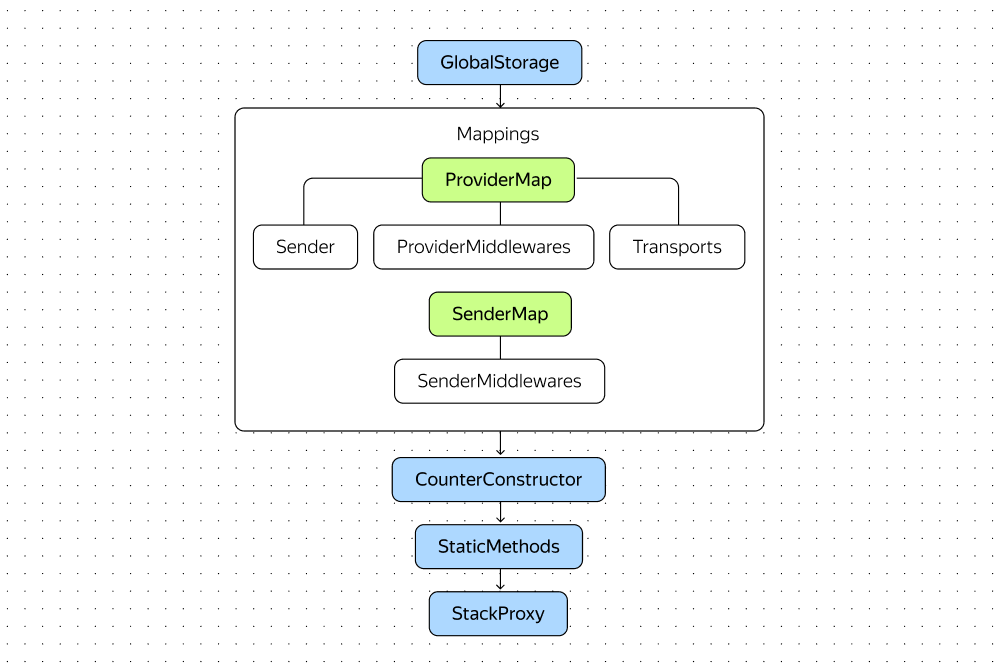 Счетчик состоит из JavaScript и HTML-кода, основными его компонентами являются провайдеры, сендеры, middleware и транспорты.
