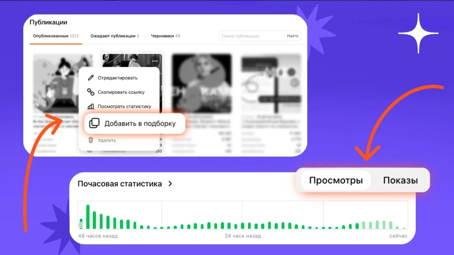 Из раздела «Публикации» теперь можно добавлять материалы в подборки напрямую. Достаточно выбрать пост курсором и кликом на три точки выбрать «Добавить в подборку».