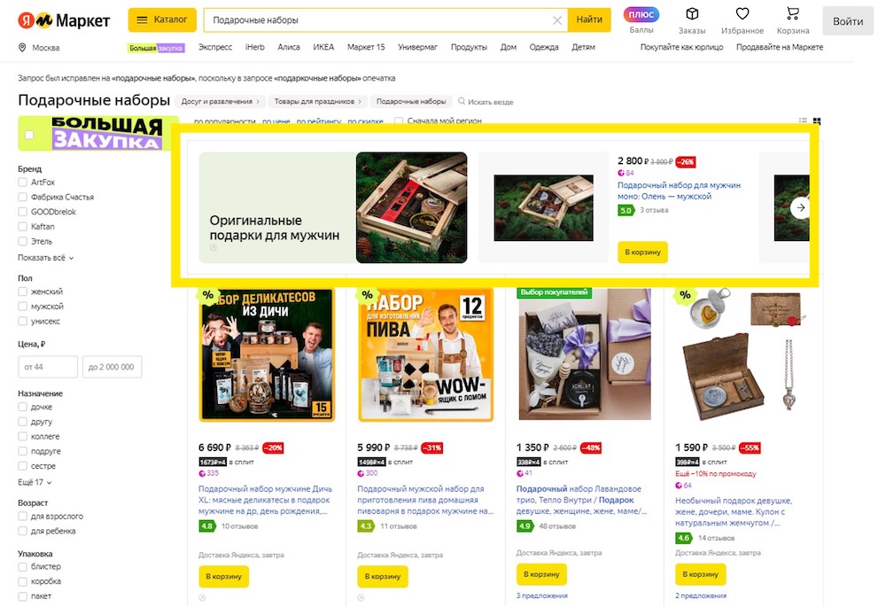 Полка с товарами – это универсальный инструмент для продвижения, который помещает предложение сверху от основных результатов выдачи. Разработчики считают, что инструмент будет полезен всем: и давним игрокам на рынке, и новичкам, которые только недавно разместили свои товары на Маркете.