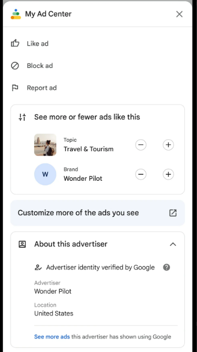 Воспользоваться центром можно через внутренний интерфейс сервиса или при помощи приложения My Ad Center. Перейти в него можно через три точки рядом с каждым объявлением. Здесь по-прежнему доступны возможности блокировки навязчивой рекламы или жалоба на объявления, нарушающих правила платформы.