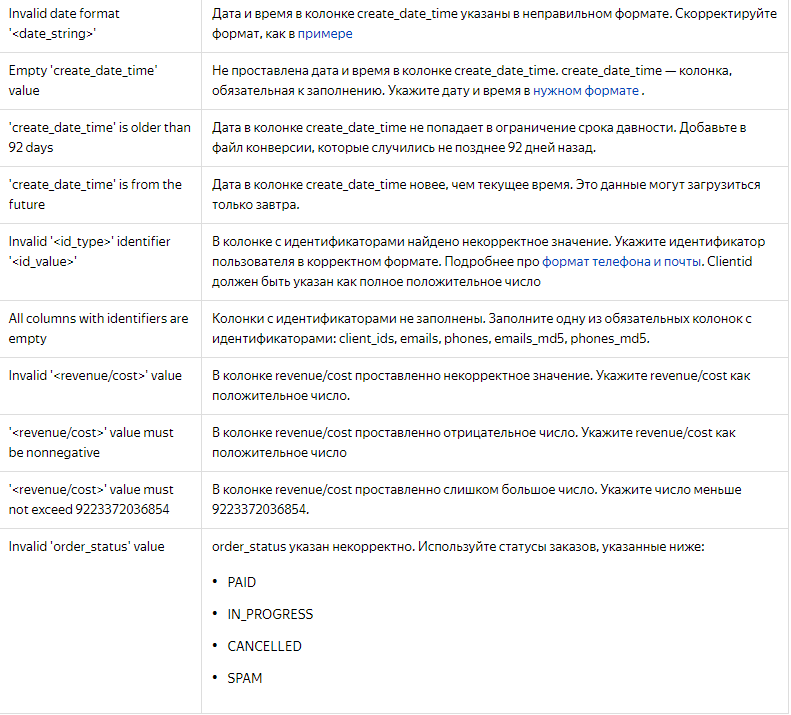 Яндекс обновил Центр конверсий. Теперь напротив невалидных строчек появится соответствующее предупреждение «Проблема». По нажатию на него можно увидеть подробное описание проблемы с возможными вариантами ее решения.