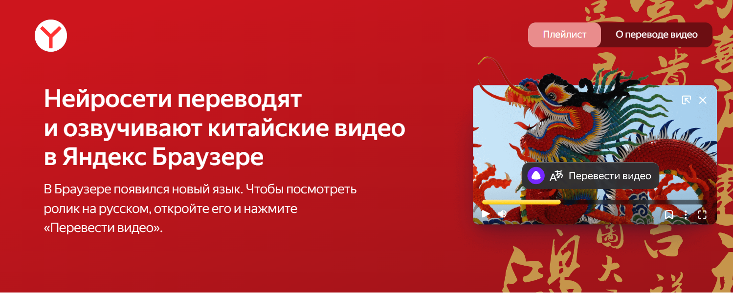 Разработчики Яндекса научили свою нейросеть переводить видео с китайского на русский. Технология уже работает на YouTube, а в ближайшее время в Браузере появится интеграция с китайским сервисом Bilibili. Также разработчики в частном порядке могут помочь с переводом видео на конкретных сайтах. Для этого необходимо связаться с ними по почте suggest-site@support.yandex.ru.