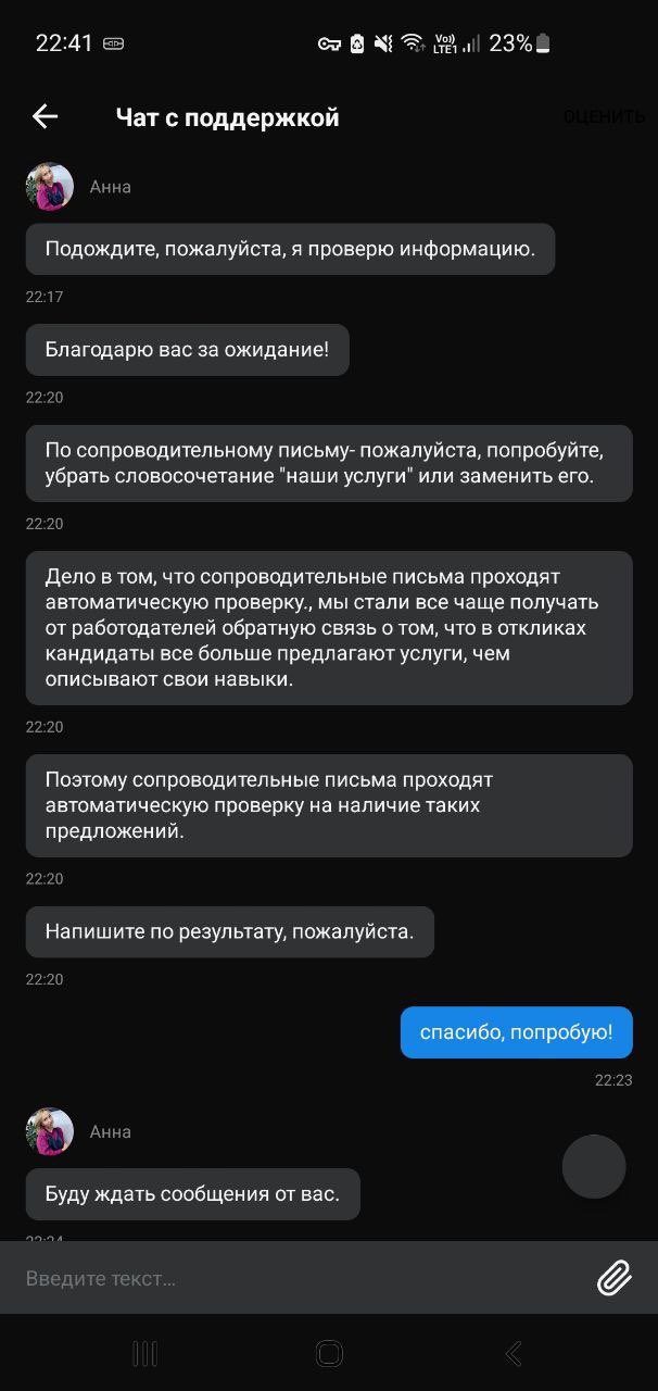 Все дело в словосочетании «наши услуги» в сопроводительном письме. Многие соискатели вместо ответа на вакансию отправляют предложения своих услуг, на что массово жалуются работодатели. Из-за этого алгоритмы сервиса автоматически отправляли сообщения с формулировкой «наши услуги» в теневой бан.